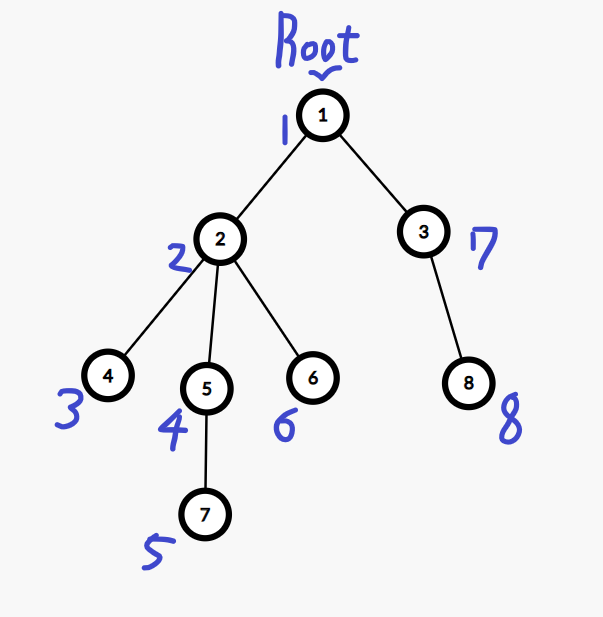 다음의 사진을 보자. (검정 : node number, 파랑 : 전위 탐색으로 넘버링 된 수)